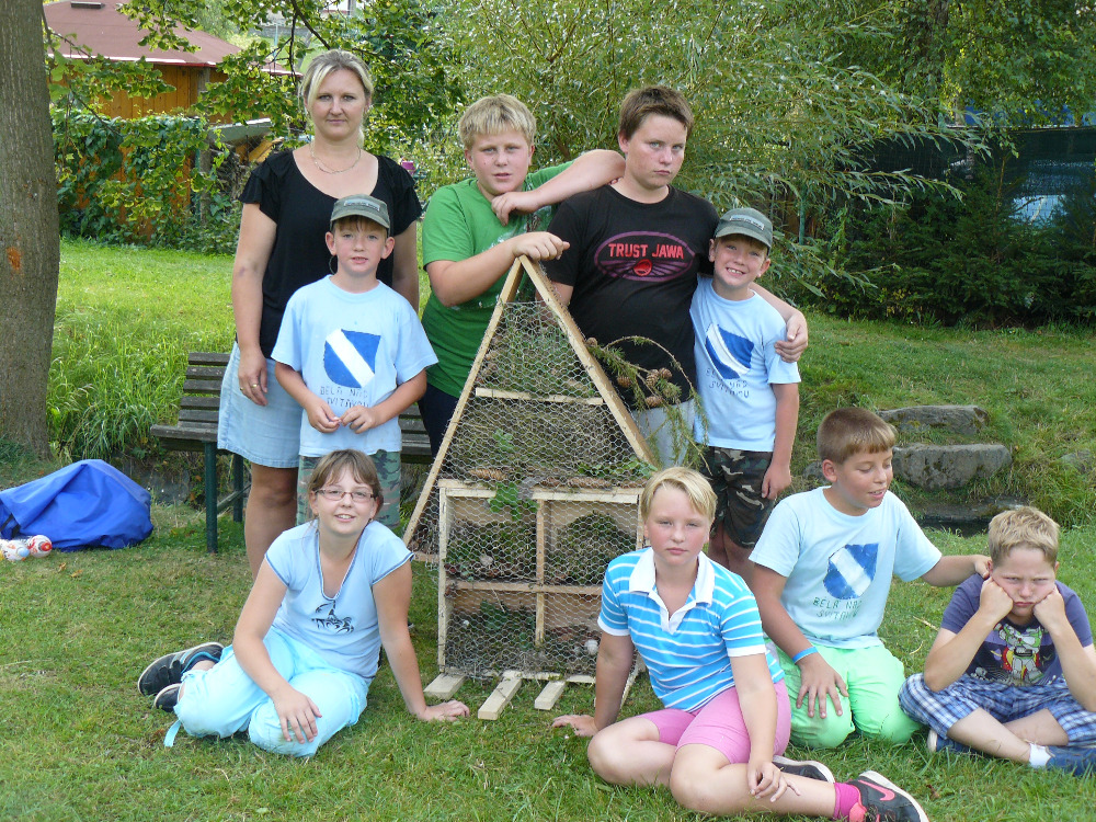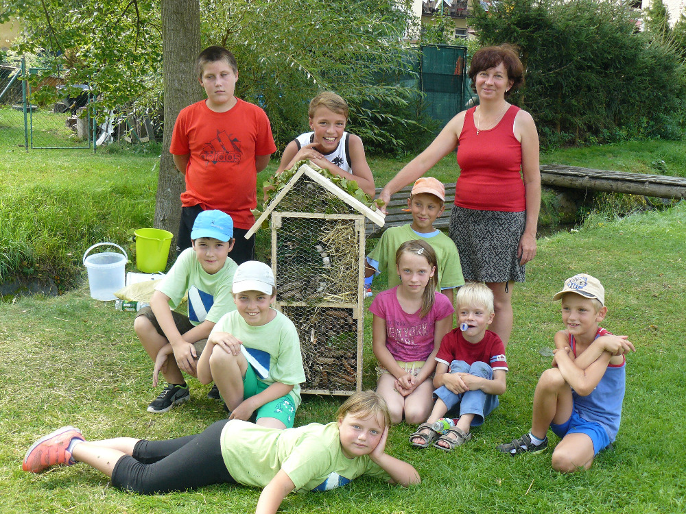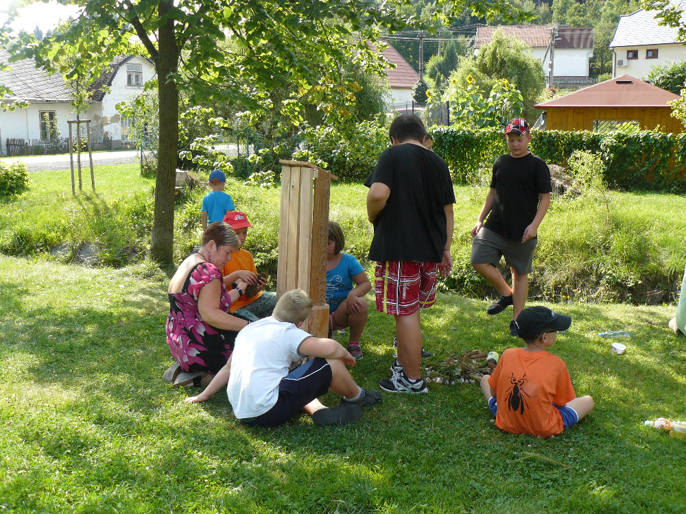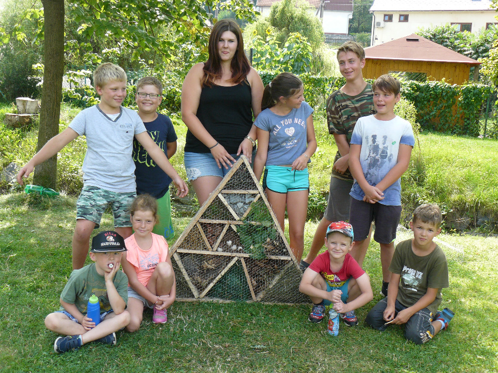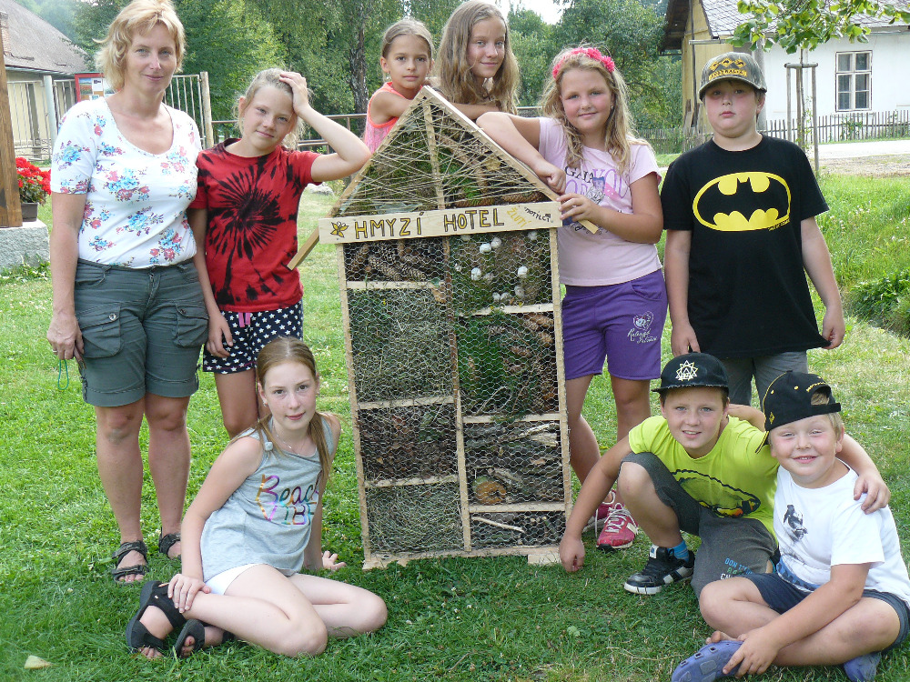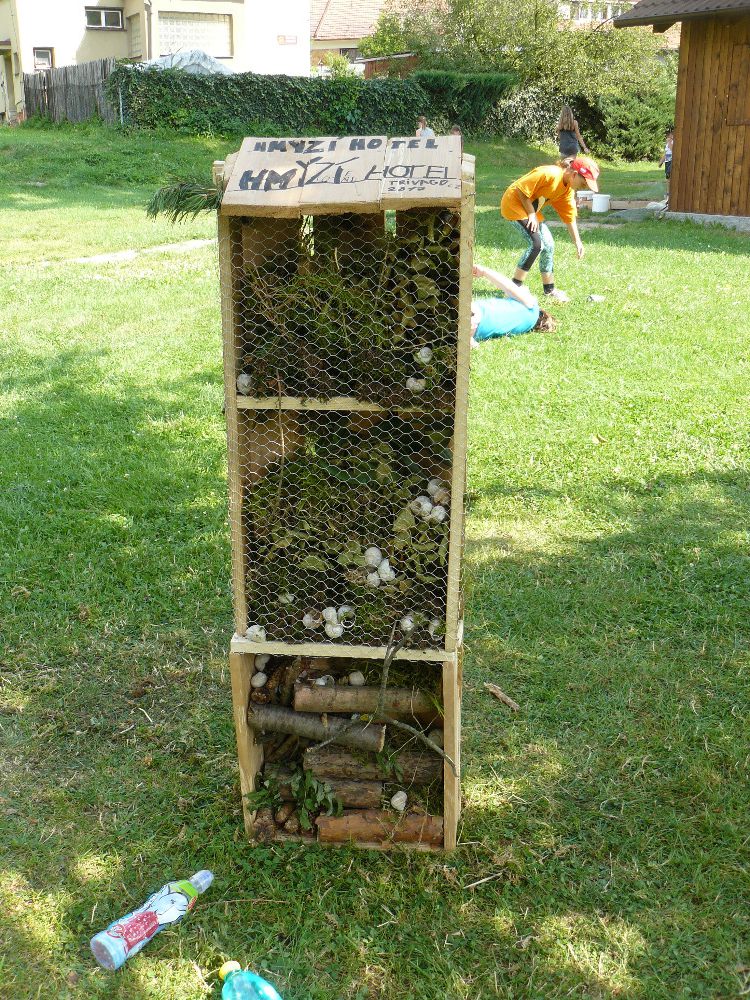 Dnešní, závěrečný den, byl pracovní. Čekala nás spousta práce s kompletováním všech tvořivých výrobků. Dodělávali jsme velkou kartu informací o hmyzu, která byla celotýdenní. Hmyzí hotel jsme vystlali a vystavěli z přírodnin. Všech pět hmyzích hotelů jsme rozmístili v různých částech obce – u MŠ, Pod Lipami, v parku naproti obchodu.