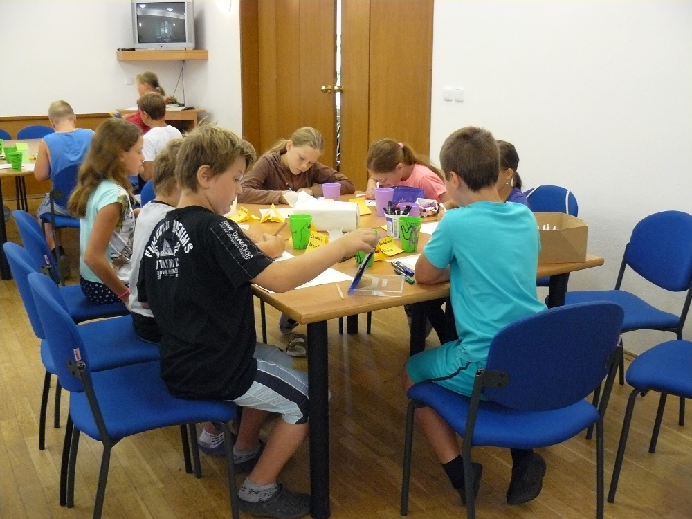 Letošní příměstský tábor jsme začali pracovně, již od 7.00 hodin si děti začaly vyrábět tematické hmyzí kamarády – brouky, mouchy, berušky na provázku, kterými se dá pohybovat.