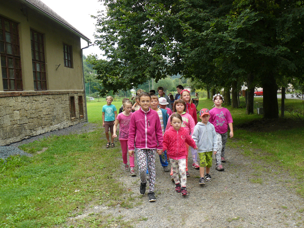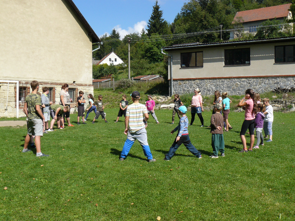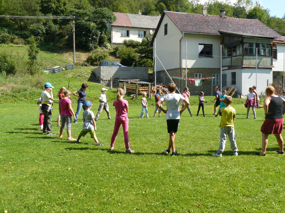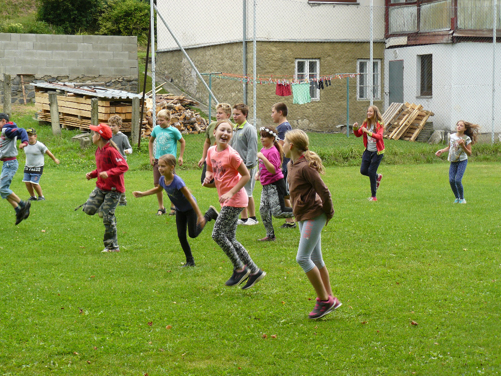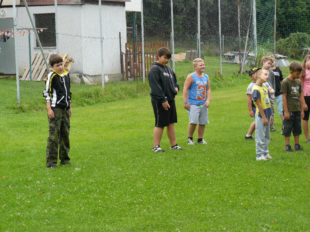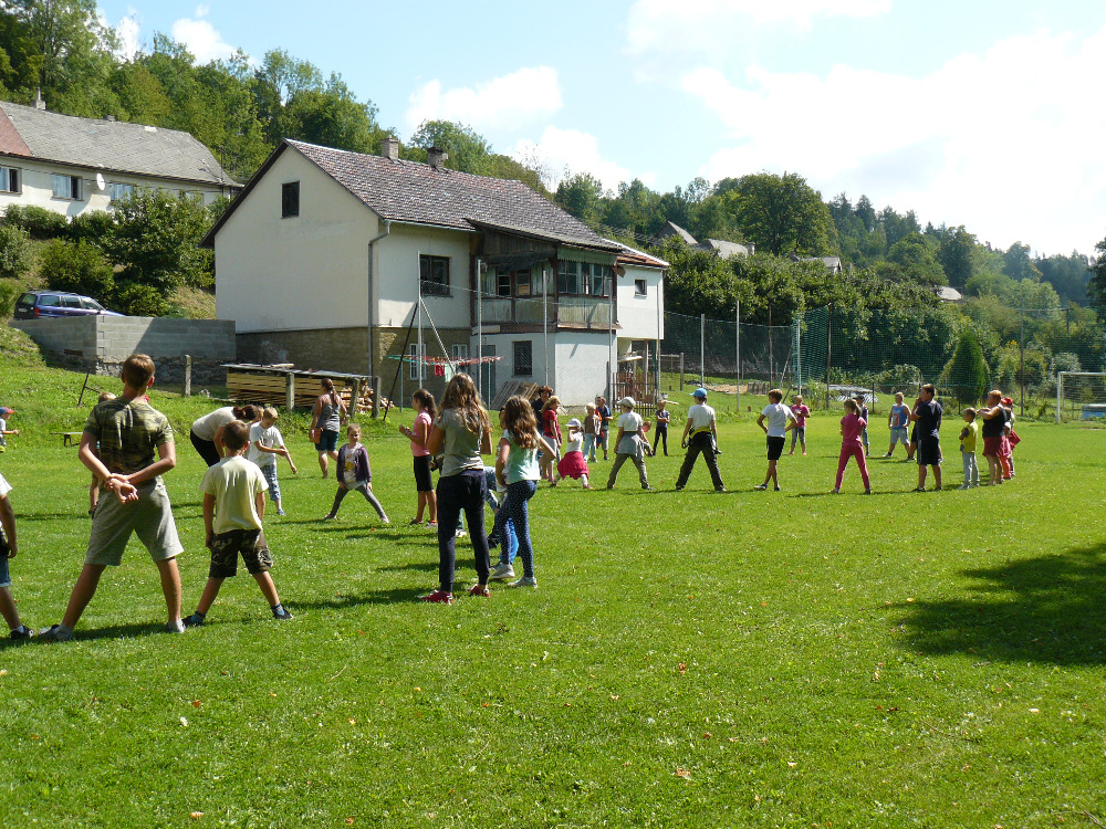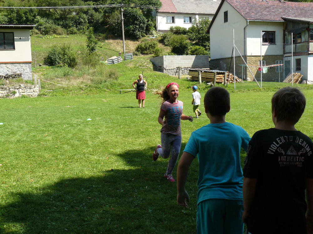 Dopoledne jsme si vyběhly k místní Sokolovně na seznamovací hry. Letošní rok se účastní na PT 46 dětí. Odpolední program byl laděný ve stejném duchu – výprava na louku za Lidmilovi, kde děti dostaly pěkné úkoly na plnění táborové celotýdenní hry.