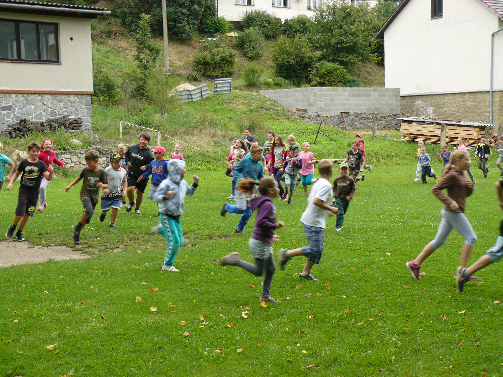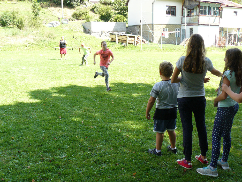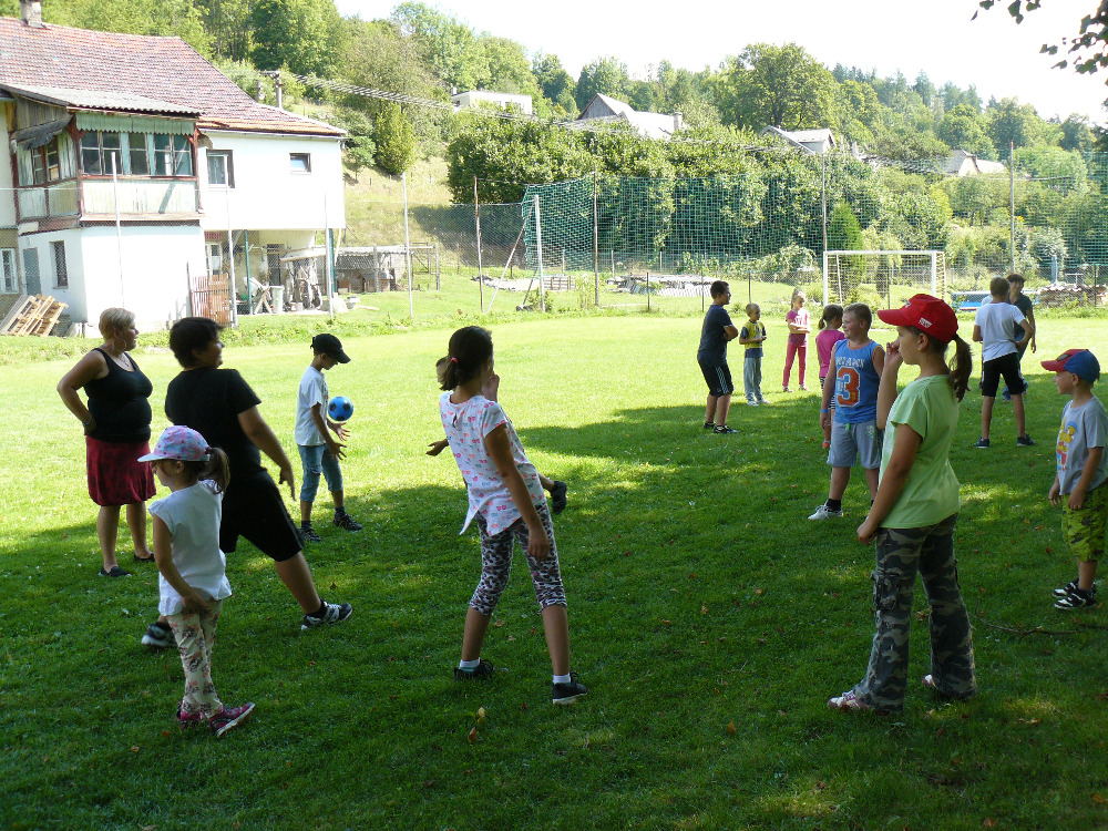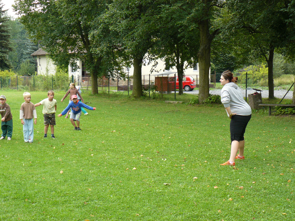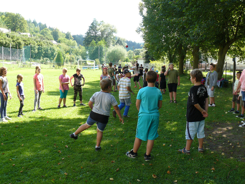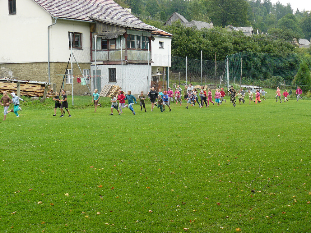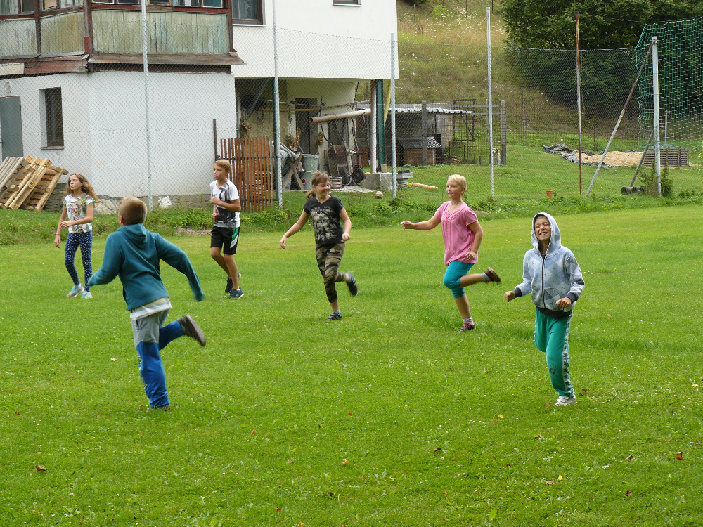 Dopoledne jsme si vyběhly k místní Sokolovně na seznamovací hry. Letošní rok se účastní na PT 46 dětí. Odpolední program byl laděný ve stejném duchu – výprava na louku za Lidmilovi, kde děti dostaly pěkné úkoly na plnění táborové celotýdenní hry.
