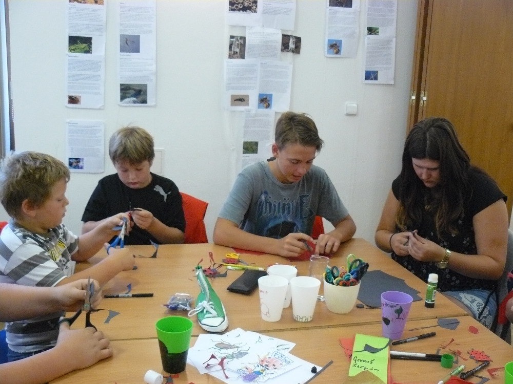 Po rozcvičce a svačině si děti namalovaly plakáty s názvem své skupiny a připravily si tak podklady na přidělované hmyzí body ( pavouci, mravenci, mouchy). Vznikly nám tak skupinky jako Howada, Černí sršni, Sršni, Motýlci a Sarančata.