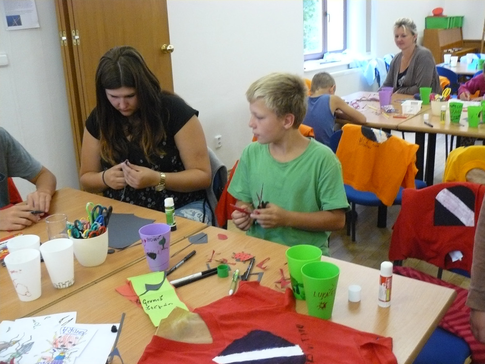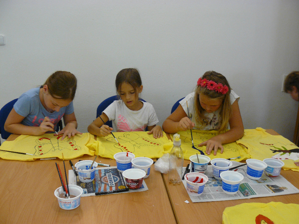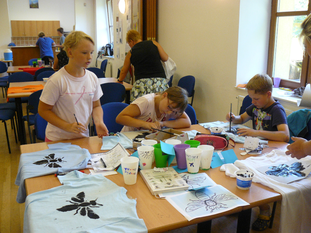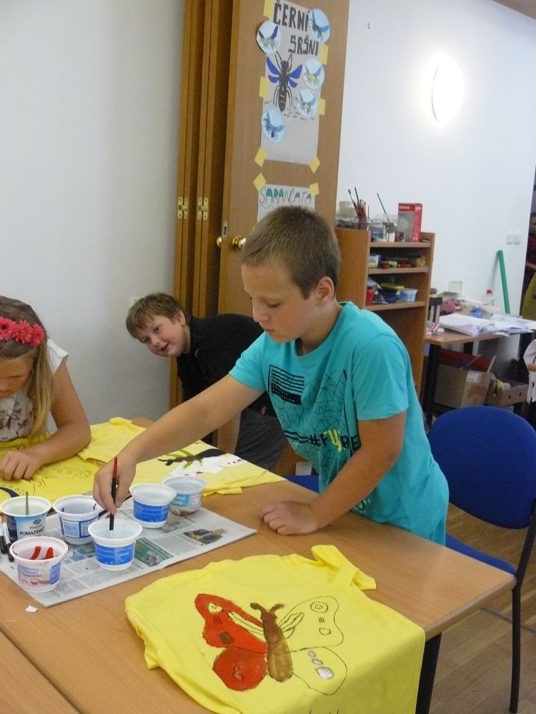 Výroba zadní strany táborového trička se ladila dle názvu skupinky. Obrázky jsme přes šablonu tiskli pomocí houbiček na tričko.