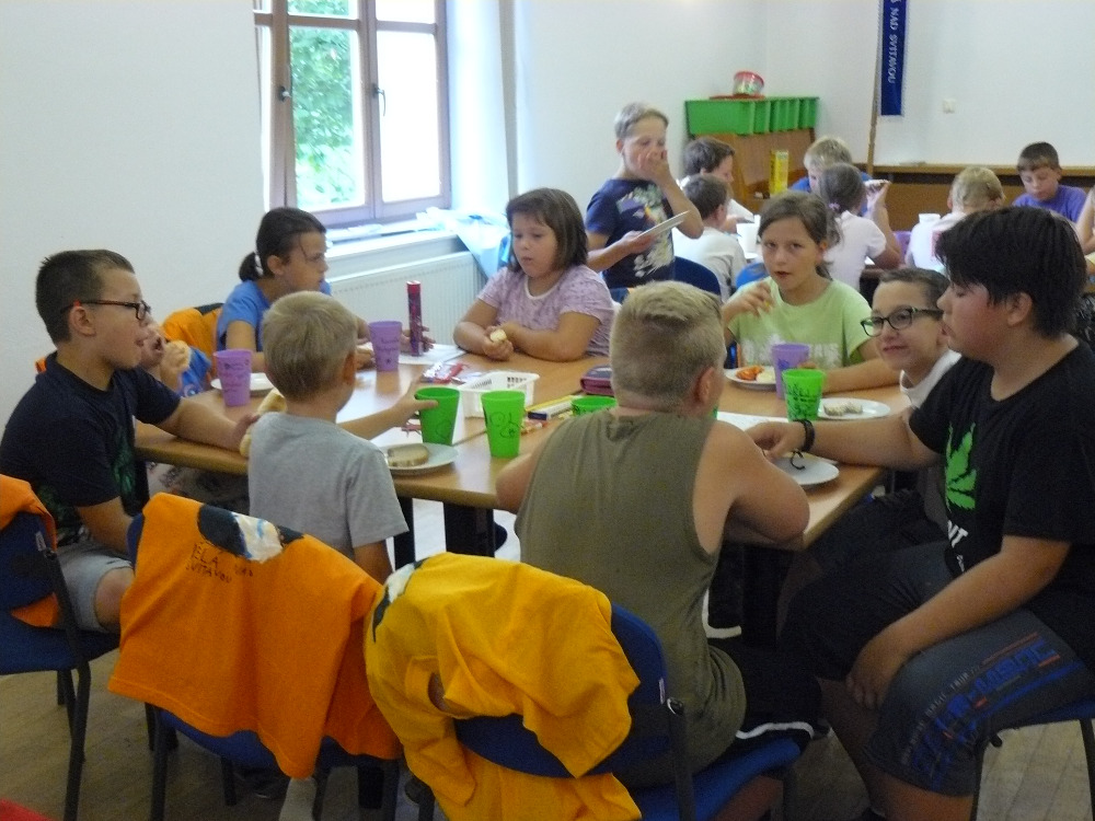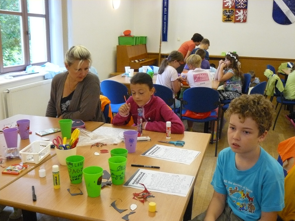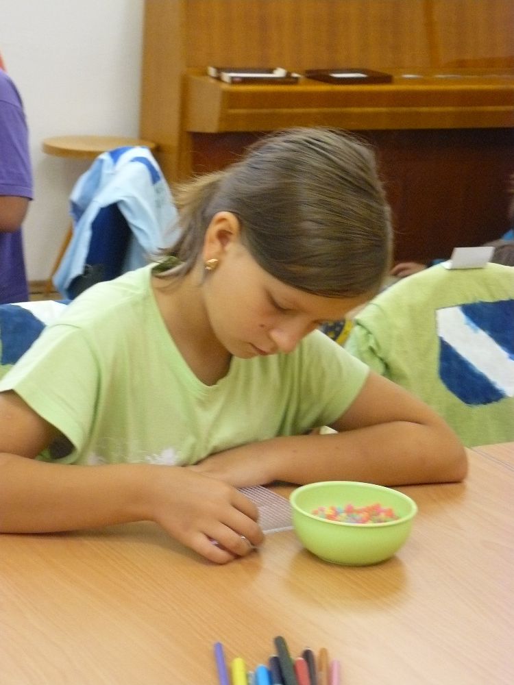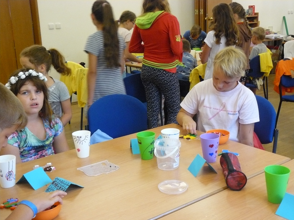 Dnešní den jsme opět započali tvořením, děti si vytvořily jednoho hmyzího zástupce – papírovou berušku na magnetku. Velikým táborovým hitem je skládání korálků na podložku. Korálky se pod pečícím papírem zažehlí a vznikne nádherně barevný obrázek ( koník, hvězda, auto, myš…. ).