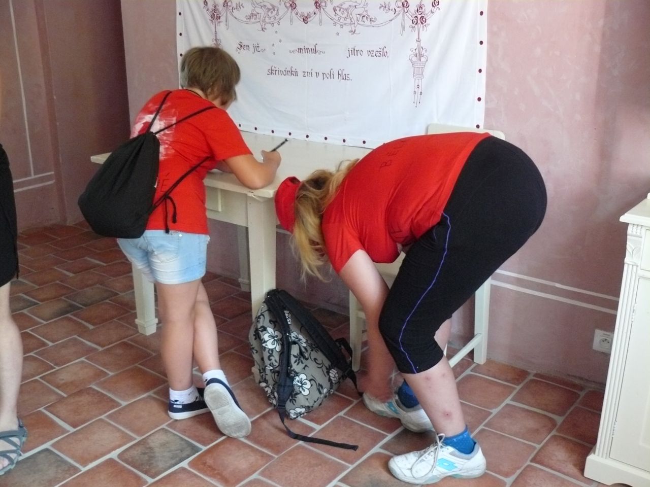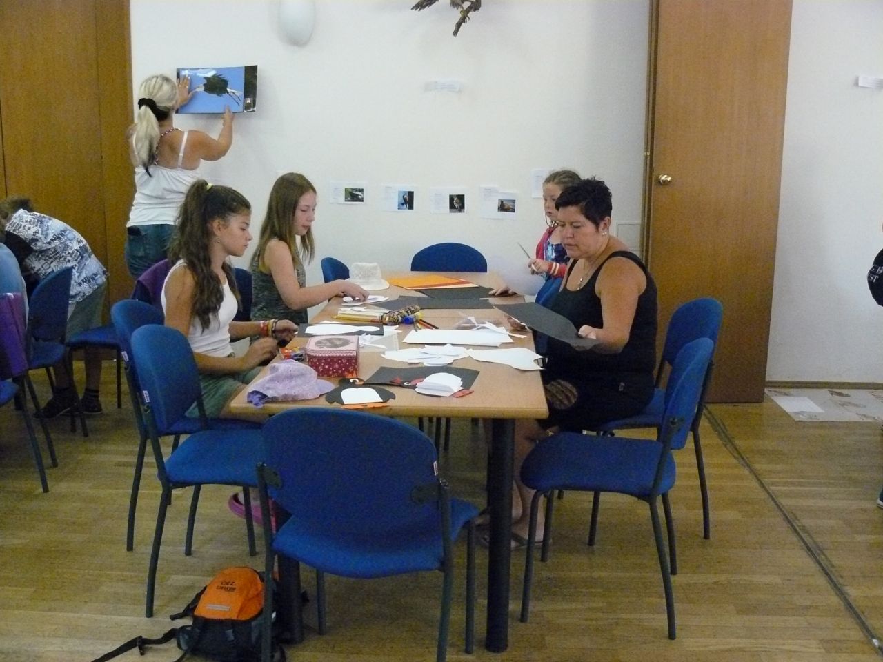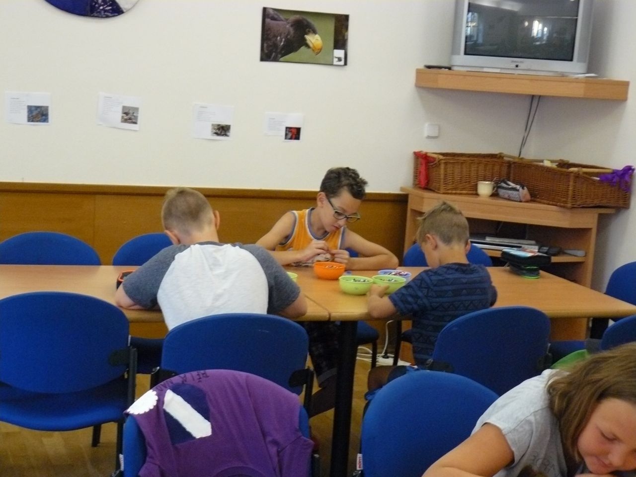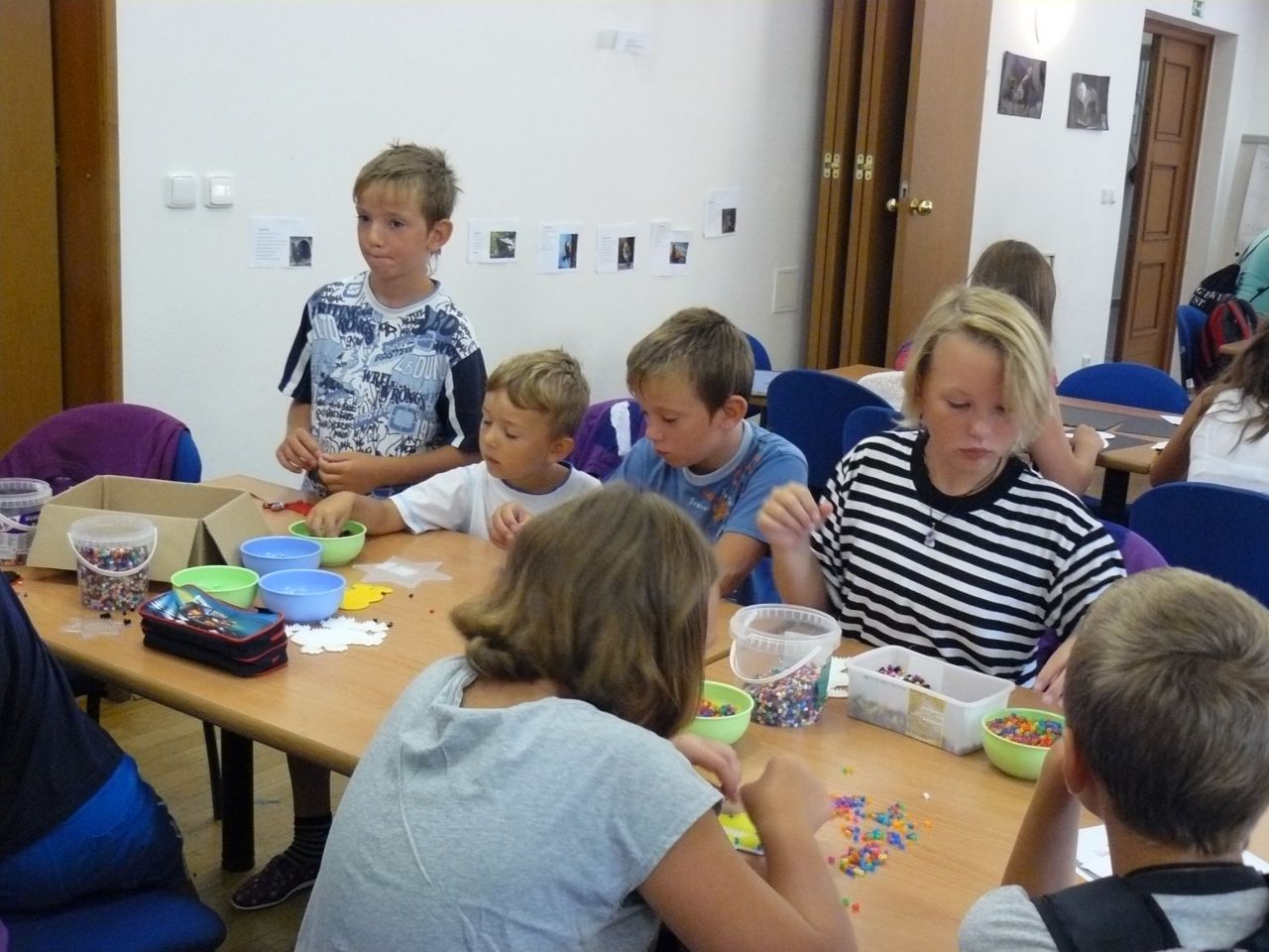 7.00 – 8.00 hod setkávání dětí před odjezdem na výlet. Plnění batůžků, kontrola před výletem. Některé děti stihly ještě vyrobit tučňáka z papírů, výrobky ze zažehlovacích korálků.