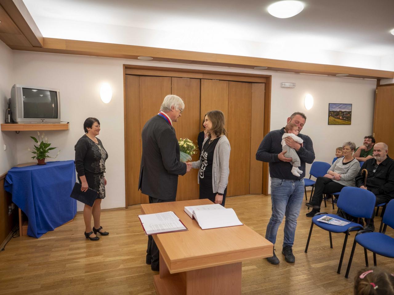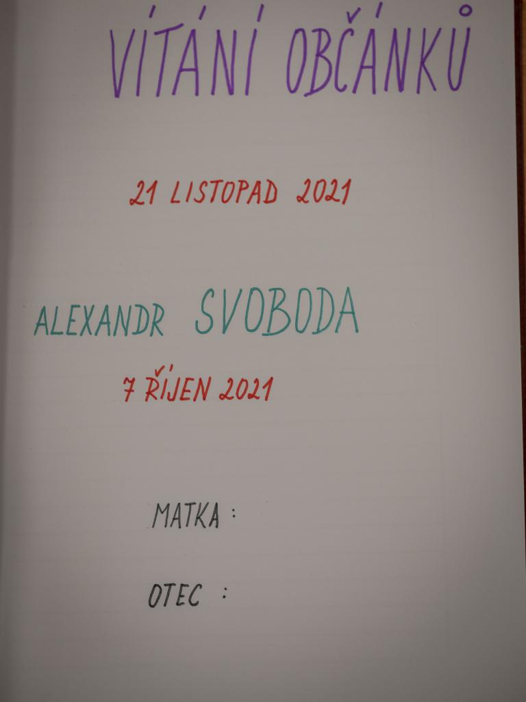 V neděli 21. 11. 2021 se ve Společenském centru sešel sbor pro občanské záležitosti, aby společně s panem místostarostou Václavem Havlů uvítali do života nového občánka – Alexandra Svobodu, syna Kateřiny Svobody Tokarchuk a Libora Svobody. Slavnostní obřad proběhl podepsáním rodičů do Pamětní knihy, maminka dostaly kytičku a dar pro dítě 3000 Kč. Paní ředitelka z MŠ Renata Trnková si připravila básničky, které děti s úsměvem na tváři zarecitovaly. Po slavnostním obřadu byli všichni pozváni na malé občerstvení.