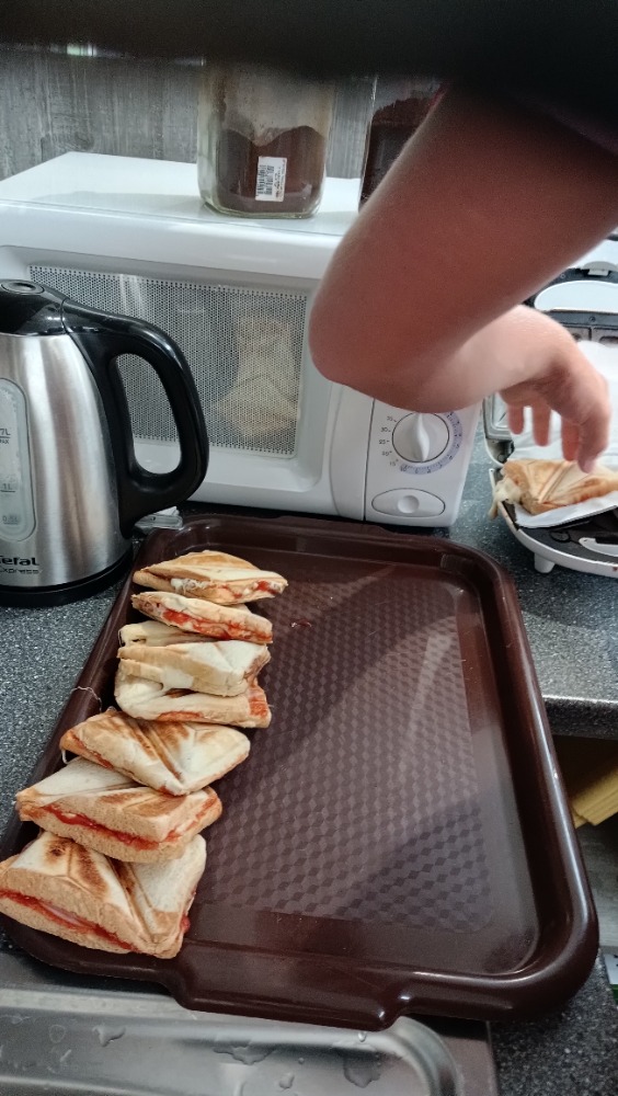 Svačina: Zapečené tousty se šunkou sýrem, zelenina. Sušenka, jablko.