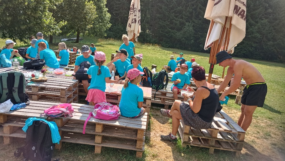 Říká se, že středa je kritický den na každém táboře a měl by být více odpočinkový. Naše děti jsou tak super, že zvládají počasí, procházky, koupaliště i různé hry. Musíme je opravdu všechny pochválit 😊.