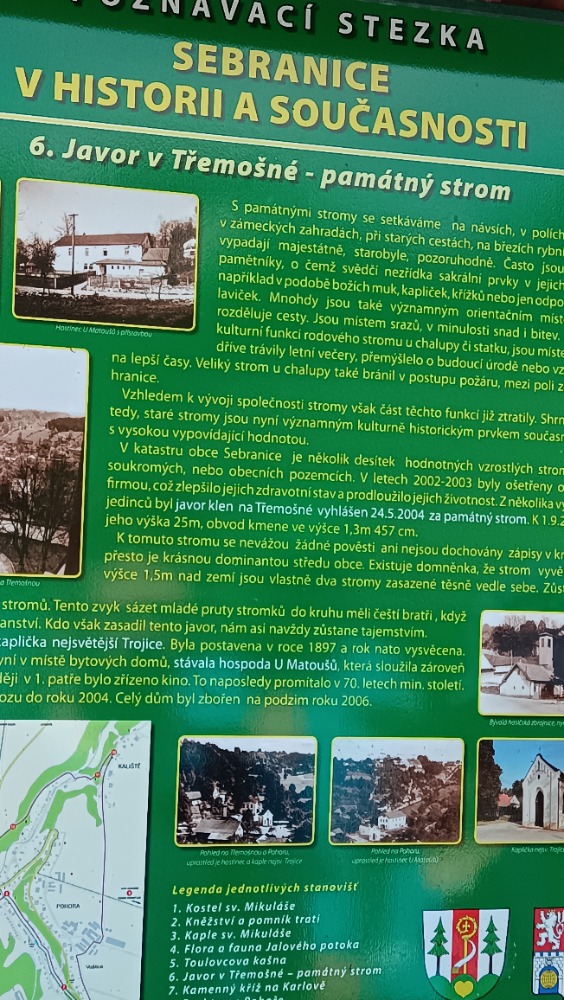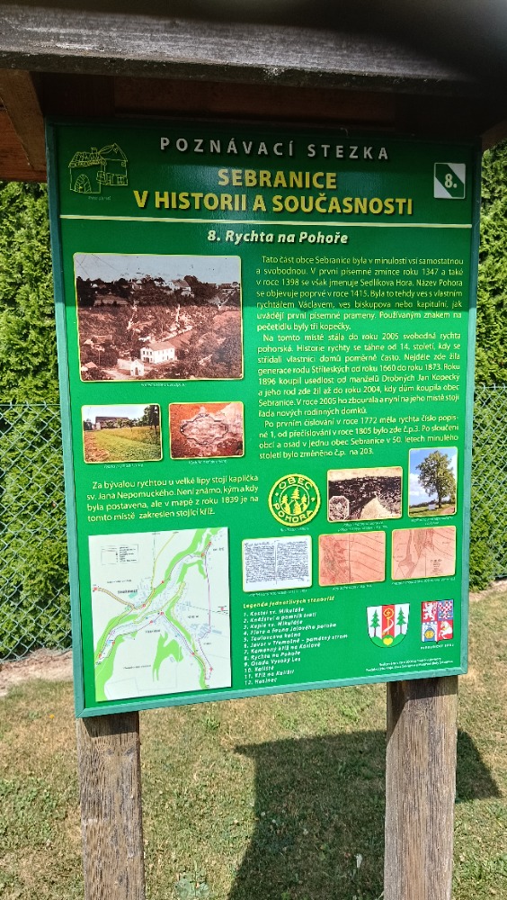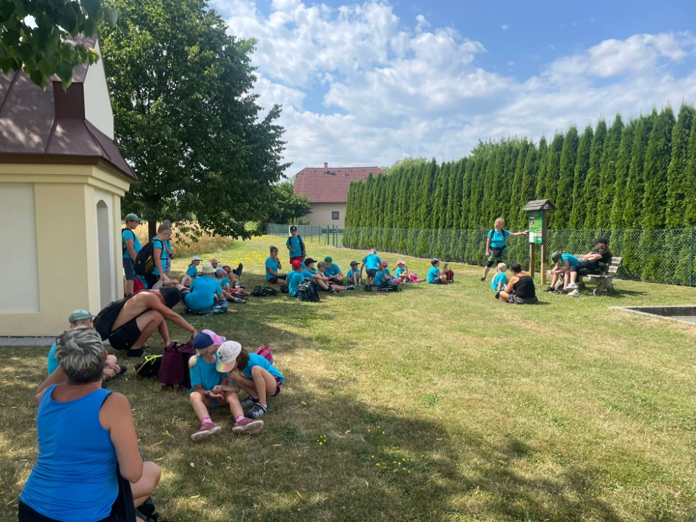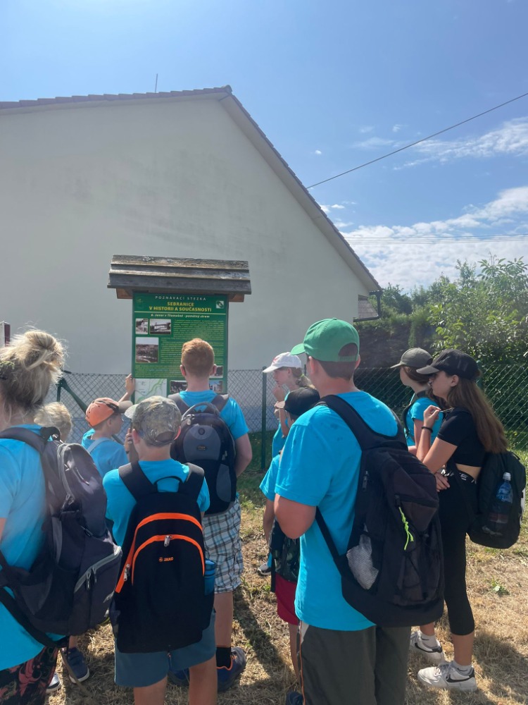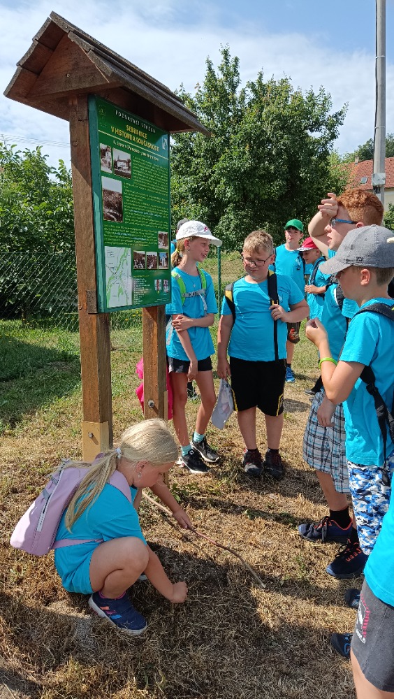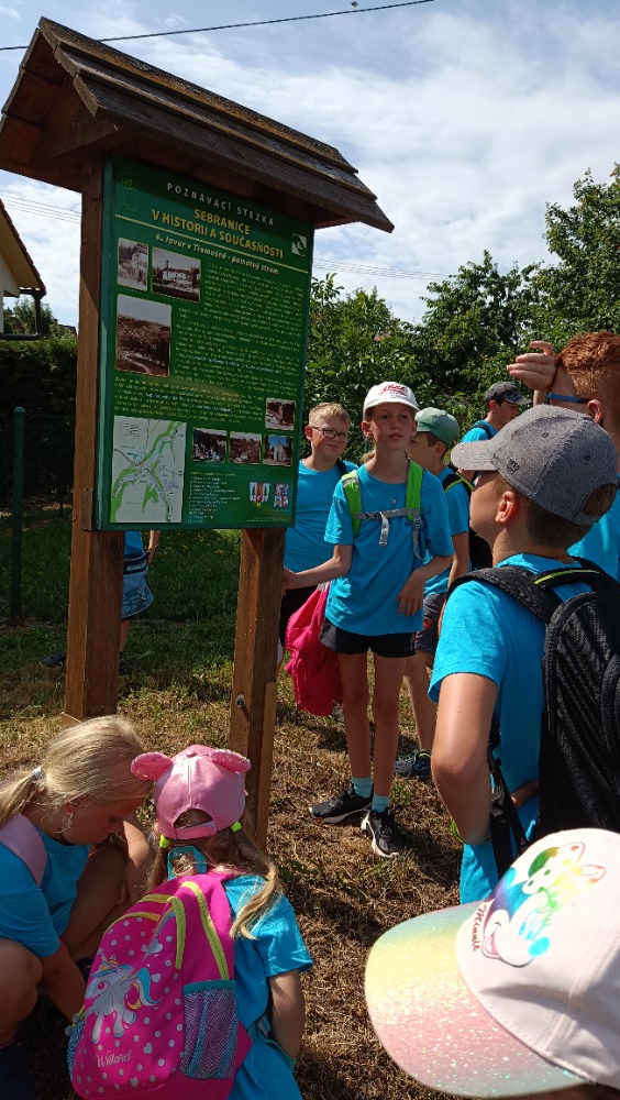 Dnešní výlet byl do vesnice Sebranice, která leží kousek od Poličky. Po svačině jsme se vydali na naučnou stezku s názvem „ Sebranice v historii a současnosti“. Tato stezka má 12 zastavení a je dlouhá asi 8.5 km. My jsme šli asi 5 km. Na informačních tabulích se dozvíme o historii zvonů v kostele, dozvíme se zajímavosti o kapličkách a křížích v katastru obce. Dostaneme se na nejvyšší bod vesnice, kterou můžeme vidět jako na dlani. My jsme si tuto stezku zkrátili, abychom stihli včas dojít na místní koupaliště, kde jsme si užili i malou skluzavku a vodní hřib s teplou vodou.