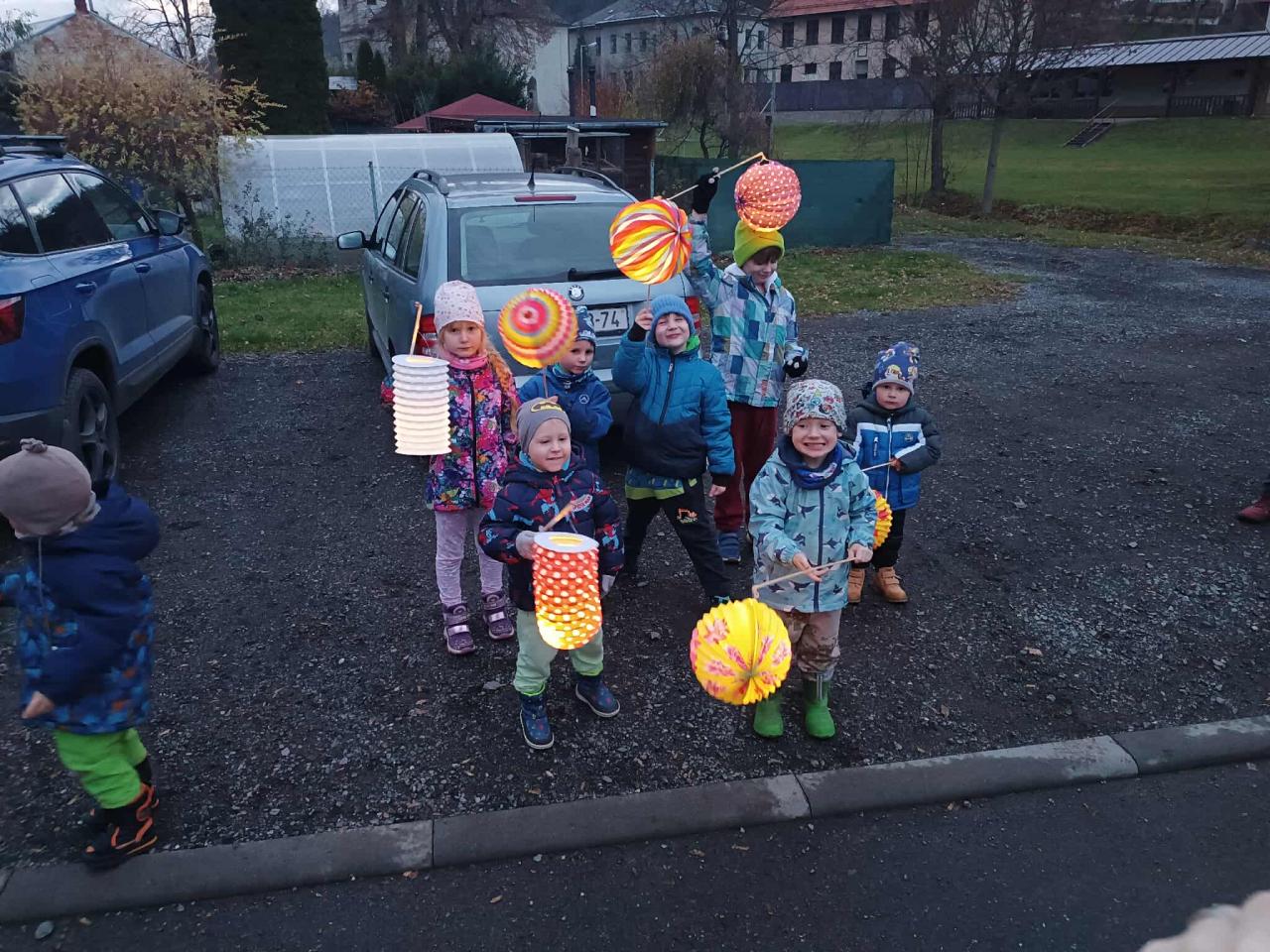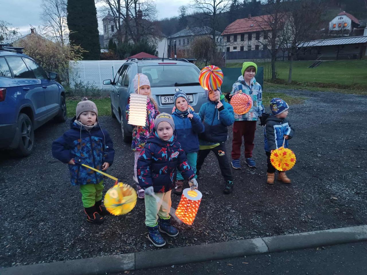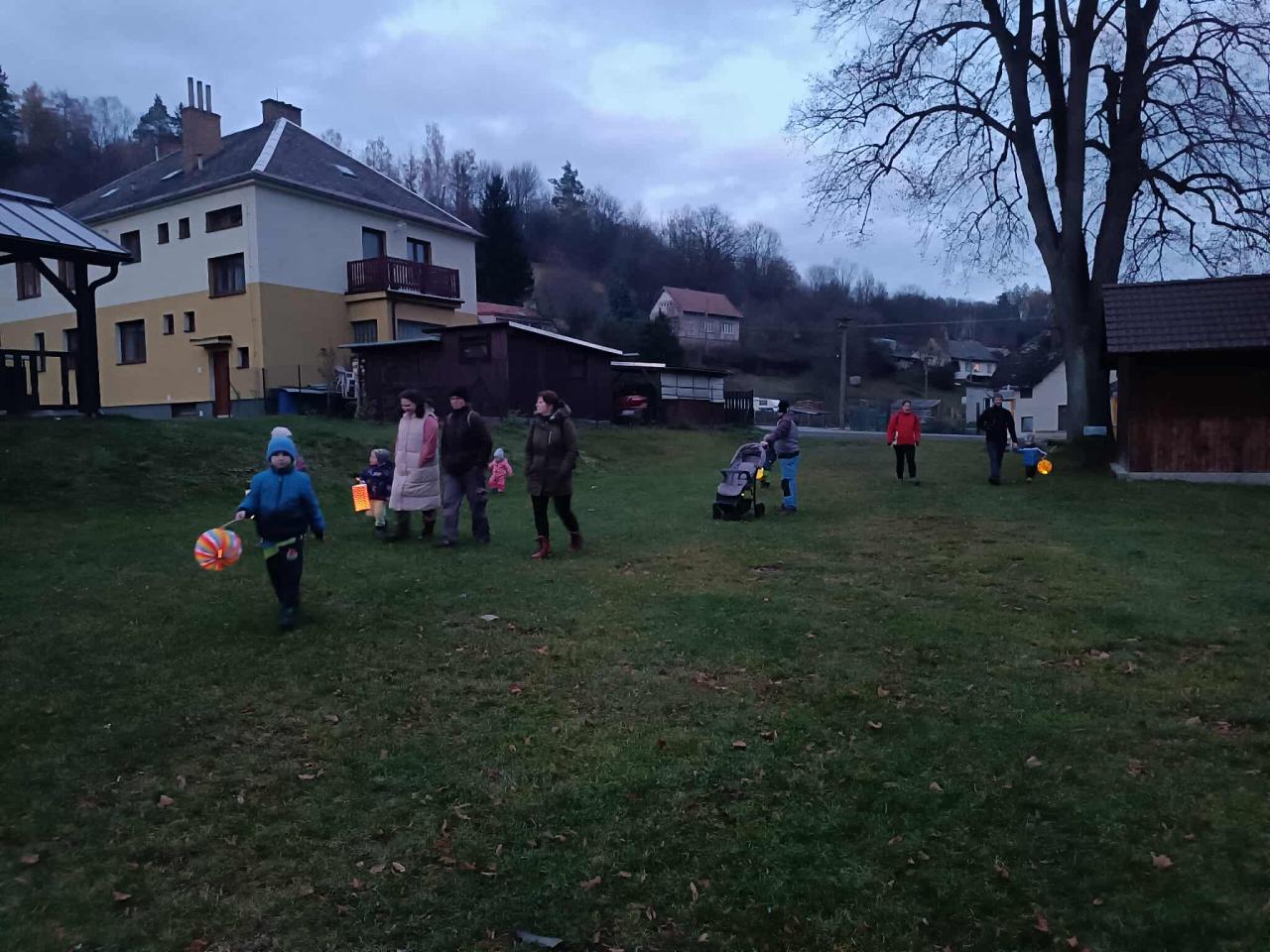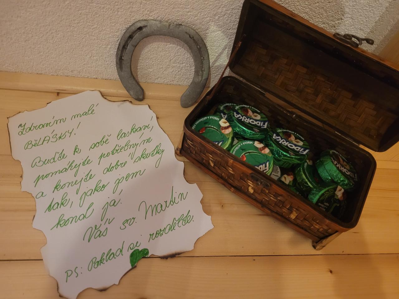 Každé dítko mělo svůj lampión a vydali jsme se na stezku „za pokladem“ od svatého Martina. Nejdříve jsme si Pod Lípami řekli, kdo svatý Martin byl. Děti vše věděly a myslím, že svými znalostmi překvapily i své rodiče. Vyprávěly, jak v dávných dobách žil rytíř Martin a ten pomohl v zimě žebrákovi – rozsekl svůj plášť mečem a polovinu dal žebrákovi, aby se mohl zahřát. Od té doby konal jen dobré skutky. Děti přemýšlely, jaké dobré skutky mohou konat i ony samy a hned jich několik vymyslely (pomáhat starým lidem, uklízet si hračky, pomáhat mamince, rozdělit se …). Také jsme si při tom povídání zopakovali kouzelná slovíčka, která k dobrým skutkům patří. Jak se více setmělo, vydali jsme se s lampiony na putování za pokladem. Naše kroky zezačátku doprovázela smůla. Nikde ani stopy po pokladu. A tak jsme si cestu zpestřili hledáním komínů, ze kterých se kouří, protože pranostika přeci praví, že „Na svatého Martina, kouřívá se z komína“. Vzpomněli jsme si, že svatý Martin neputoval sám, že jel přeci na bílém koni. V tu chvíli naše cesta byla jasně daná. Protože to děti v naší obci moc dobře znají, věděly, že i my máme ve Bělé bílého koně - třeba právě tam Martin zanechal svůj poklad! Když jsme došly k ohradě, nejdříve to vypadalo, že ani zde na nás nic nečeká. V tu chvíli se ale na zemi objevila opravdová podkova. To bylo znamení, že naše krok vedly správným směrem! Po chvilce pátrání (což ve tmě není úplně tak jednoduché) děti našli poklad společně s dopisem, který nám zde zanechal svatý Martin. Vše dobře dopadlo a my se jen těšíme, kdy nám svatý Martin přiveze sníh. J