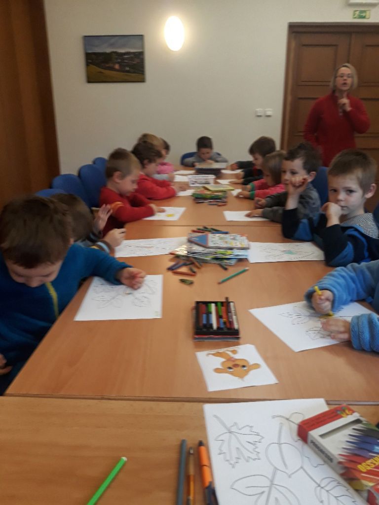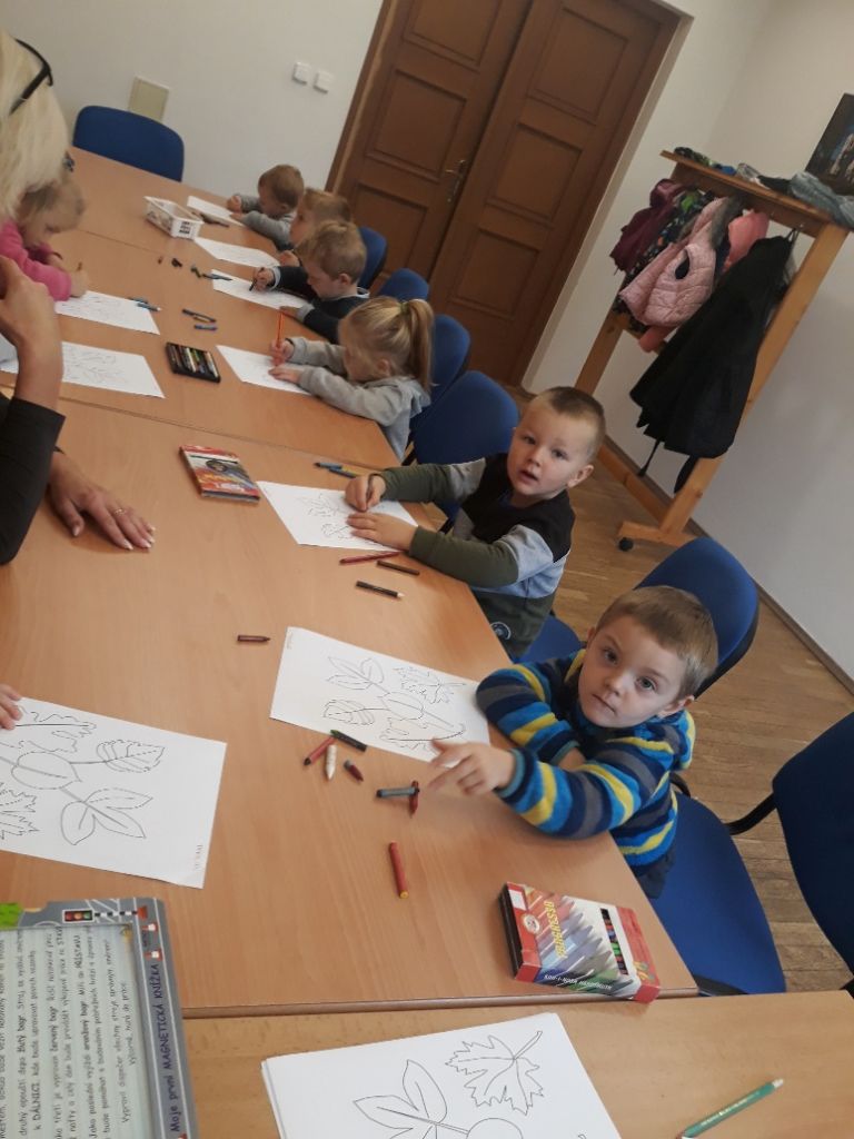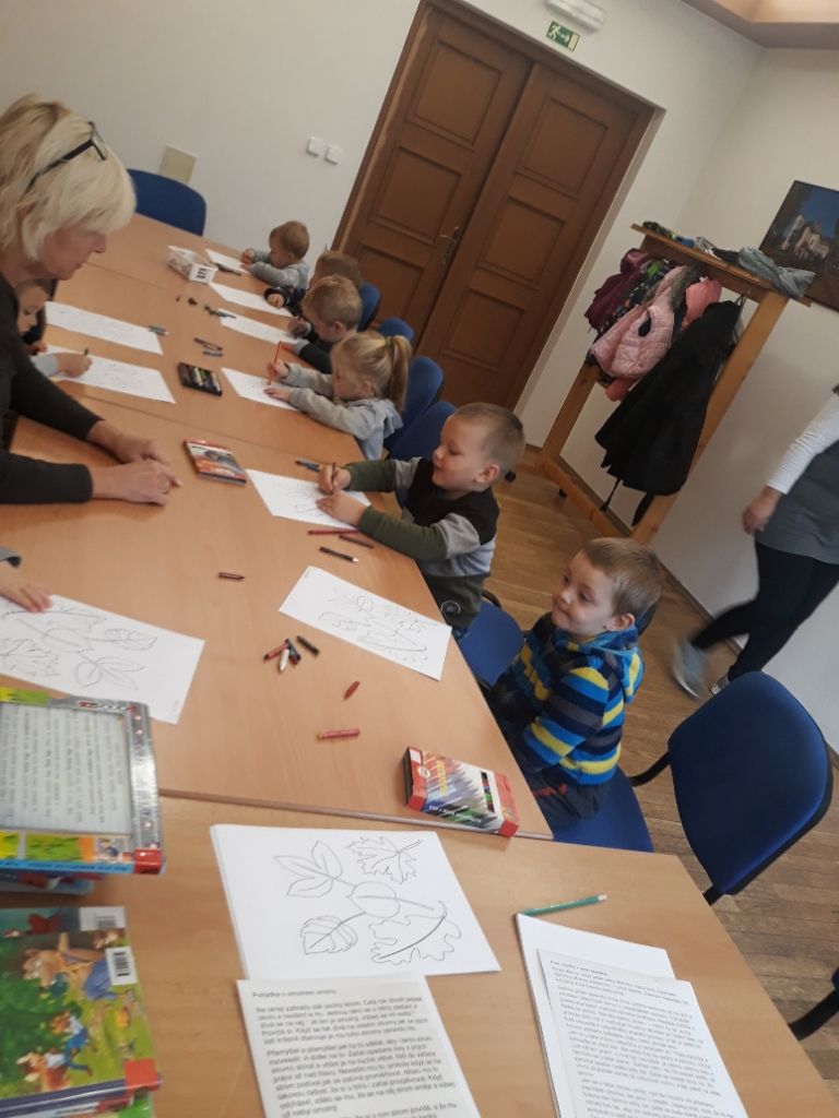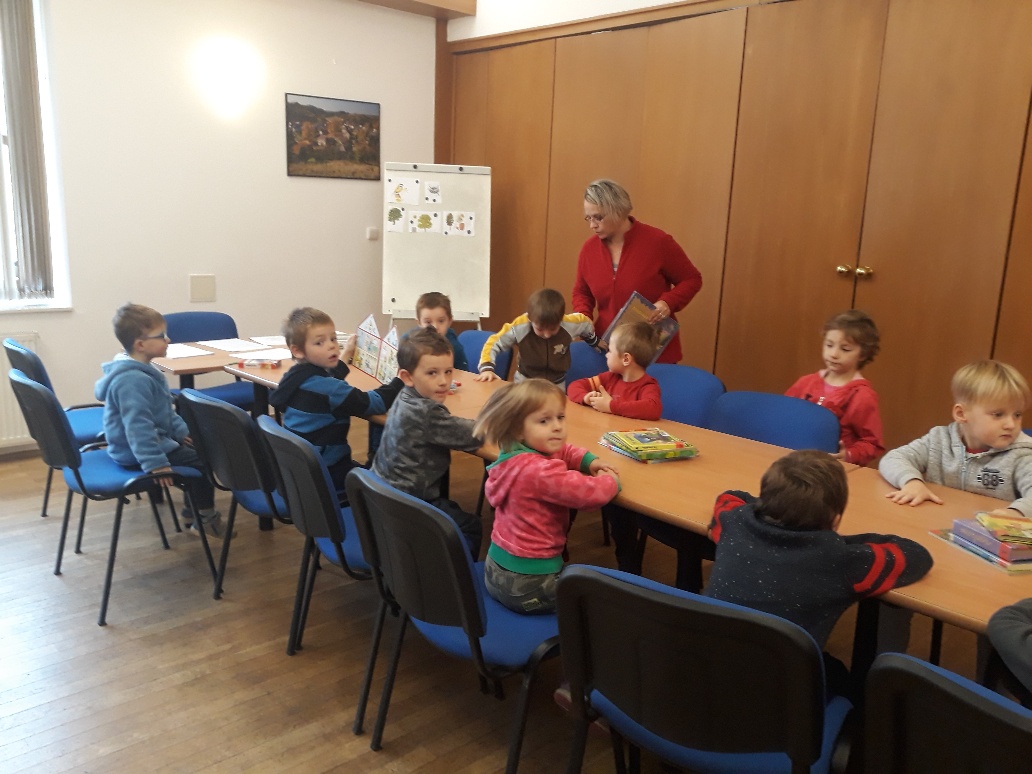 Ve čtvrtek 7.11.2019 dopoledne se přišly děti z malého i velkého oddělení podívat do místní knihovny, aby se seznámily s provozem a se službami, které je tam možné využívat.Byl pro ně připraven krátký program. Malé děti si poslechly pohádku na podzimní téma O smutném stromu a velčáci pohádku Proč modřín v zimě opadává? Vymalovaly si obrázek a našel se i čas na prohlédnutí nových knížek pro děti.